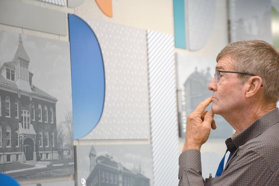 at a wall of photos featuring former schools in the district. At right, Gardner visits the elementary school library. He talked about the importance of libraries, and recalled as a teenager driving his grandmother to meetings because she was one of the leading forces to establish the interlibrary loan system. REGISTER/VICKIE MOSS