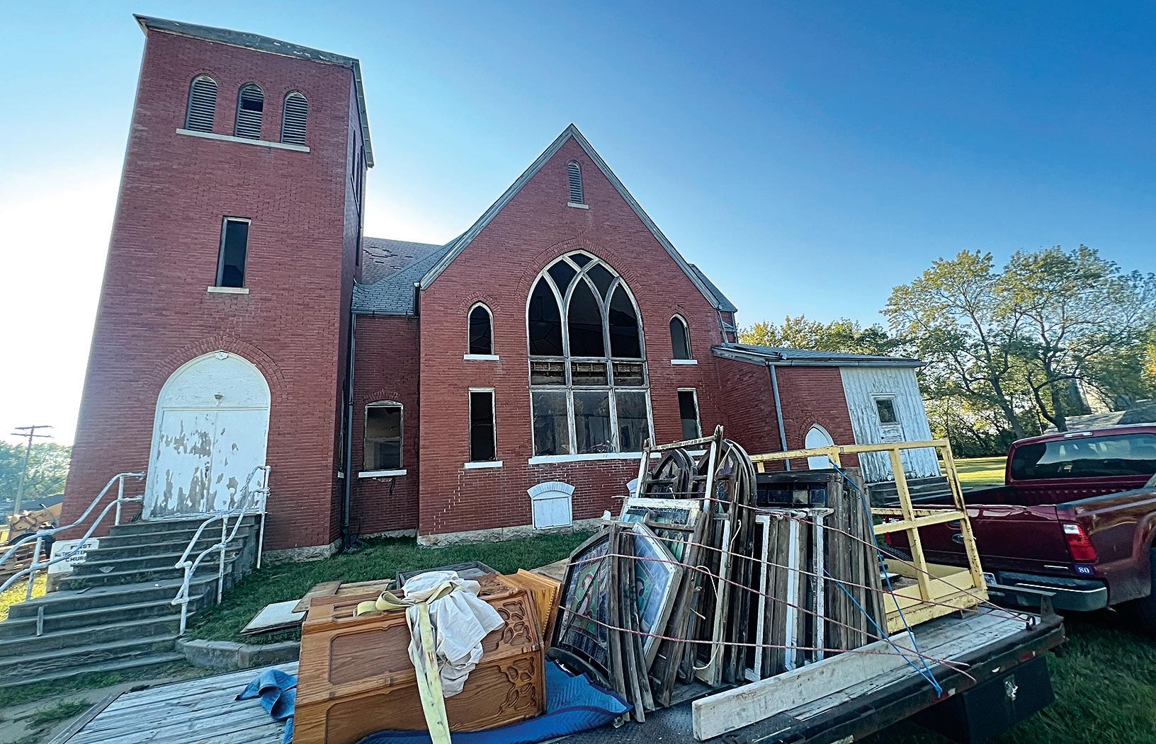 LAHARPE — In what’s better described as a disassembling than demolition, Joe Works is taking down the old LaHarpe Methodist Episcopal Church, brick by brick. Works, of Humboldt, is salvaging what he can from the 119-year-old structure, namely the church’s ornate stained glass windows and as many bricks as he can save.