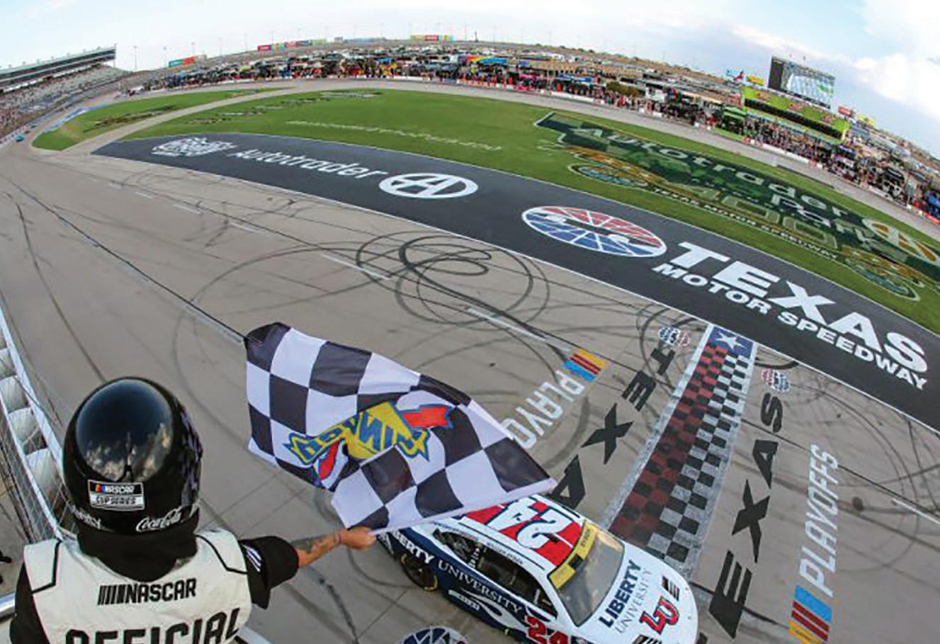 William Byron, driver of the No. 24 Liberty University Chevrolet, takes the checkered flag to win the Cup Series Autotrader EchoPark Automotive 400 at Texas Motor Speedway Sunday. (Jonathan Bachman/Getty)