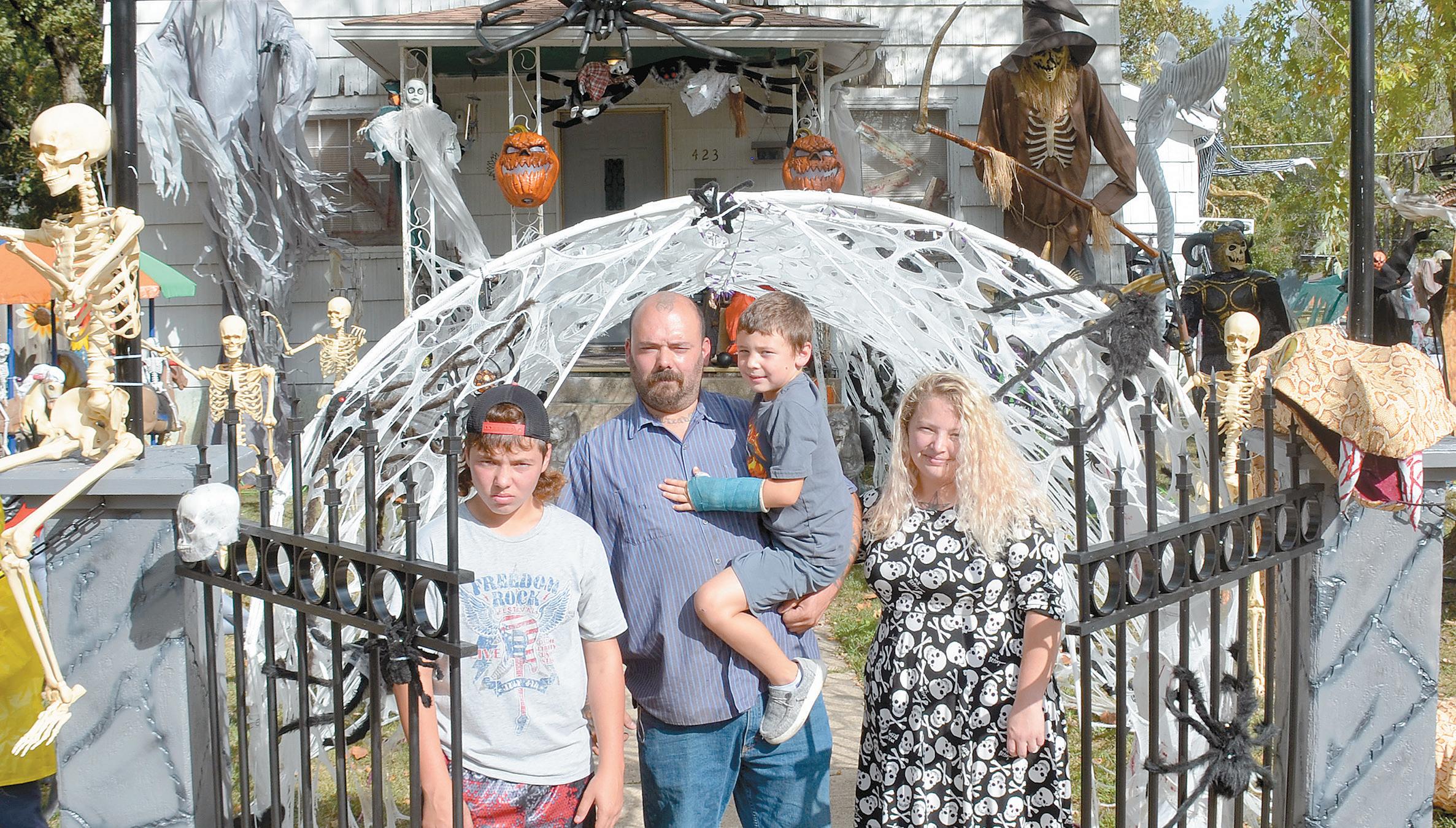 The LaCrone family embraces Halloween with a massive display that’s fun, creepy and scary all at the same time at their home at South and Spruce streets. From left, Evan, Dustin, Jace and Sarah LaCrone. REGISTER/VICKIE MOSS