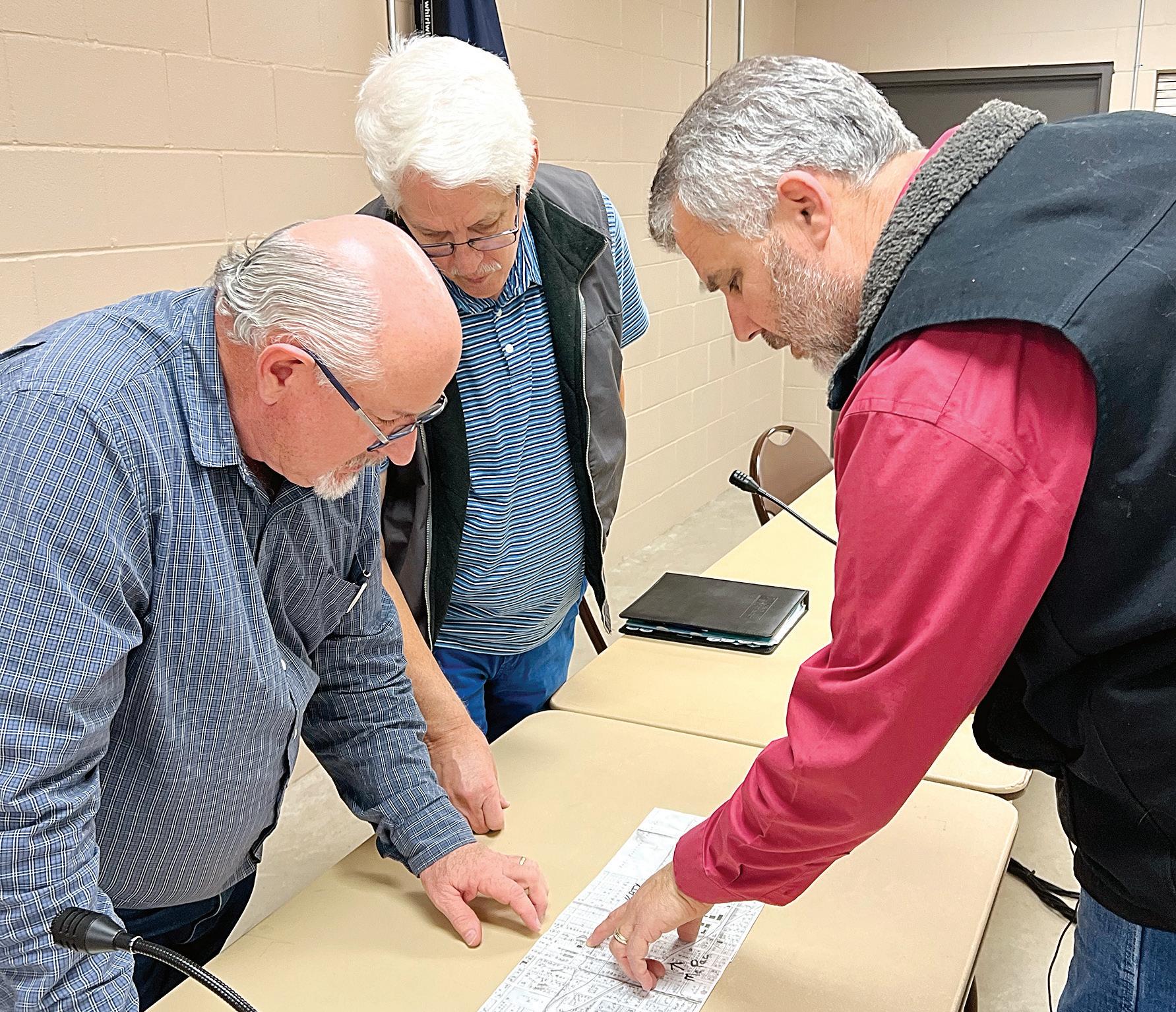 Iola Mayor Steve French, from left, City Councilman Mark Peters and Assistant City Administrator Corey Schinstock look over an early map of Iola Monday showing where the Missouri Pacific and Katy Railroads passed through the east part of town in Iola’s early years. REGISTER/RICHARD LUKEN