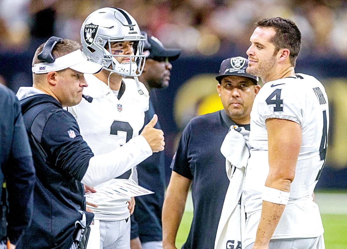 Raiders head coach Josh McDaniels, left, says Jarrett Stidham (3) will replace Derek Carr (4) as starting quarterback. TNS