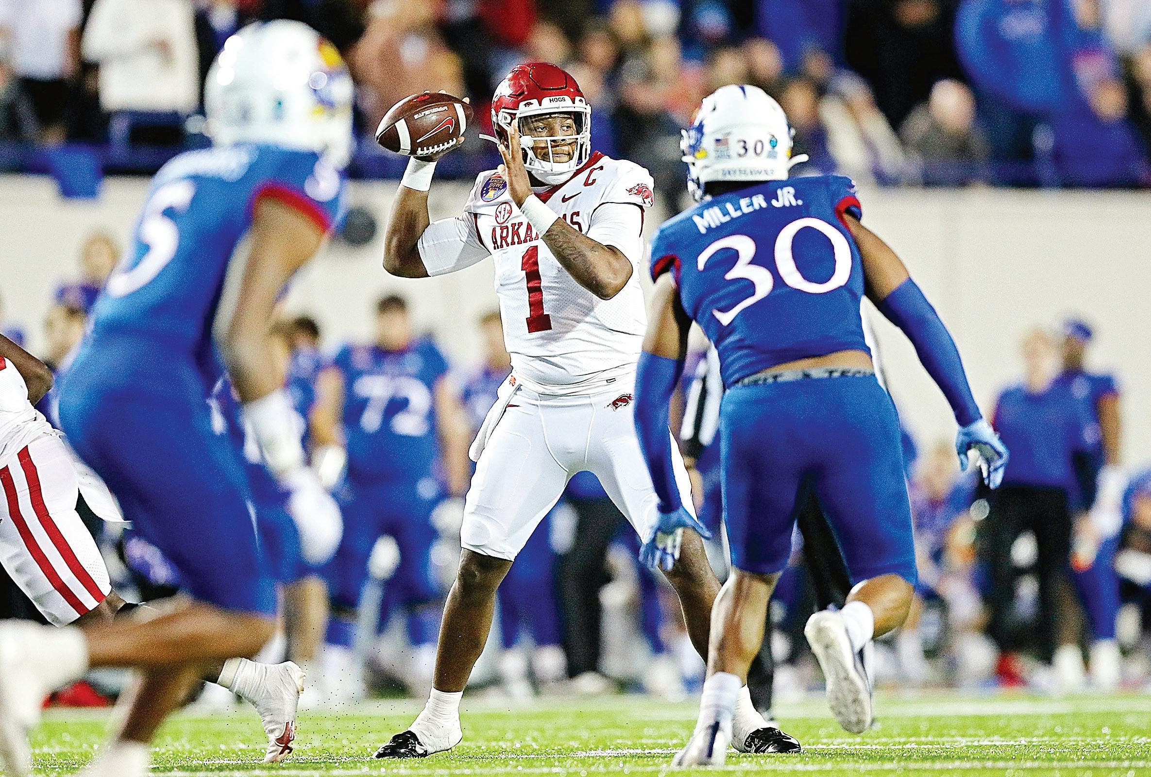 The Razorbacks’ defensive line pushed its way through a KU offensive line that had allowed just nine sacks all season. Arkansas sacked Daniels three times Wednesday night.