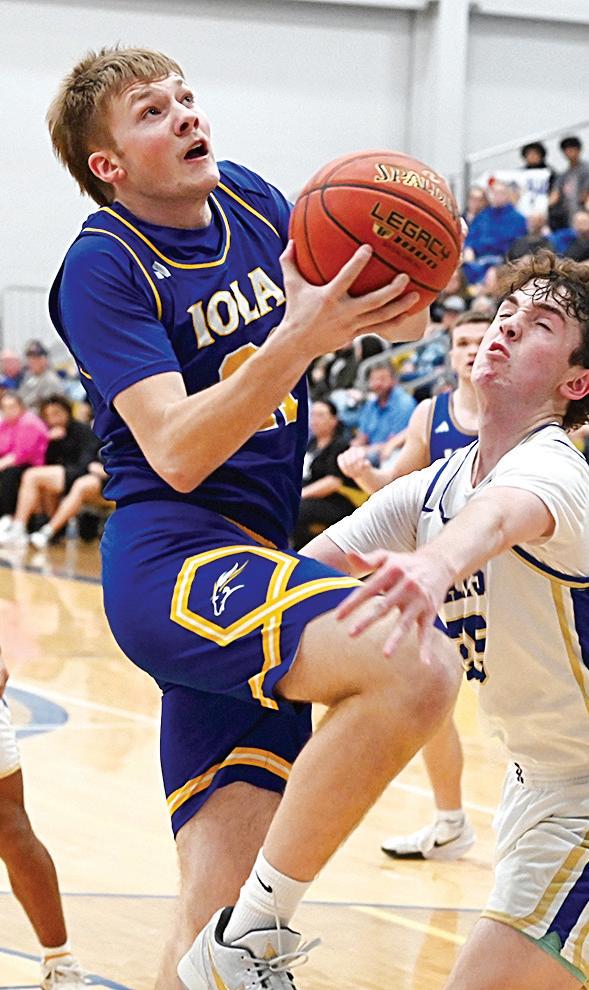 Iola High’s Jordy Kaufman puts up a shot while being guarded by Riverton’s Levi Mann (35) Friday. REGISTER/RICHARD LUKEN