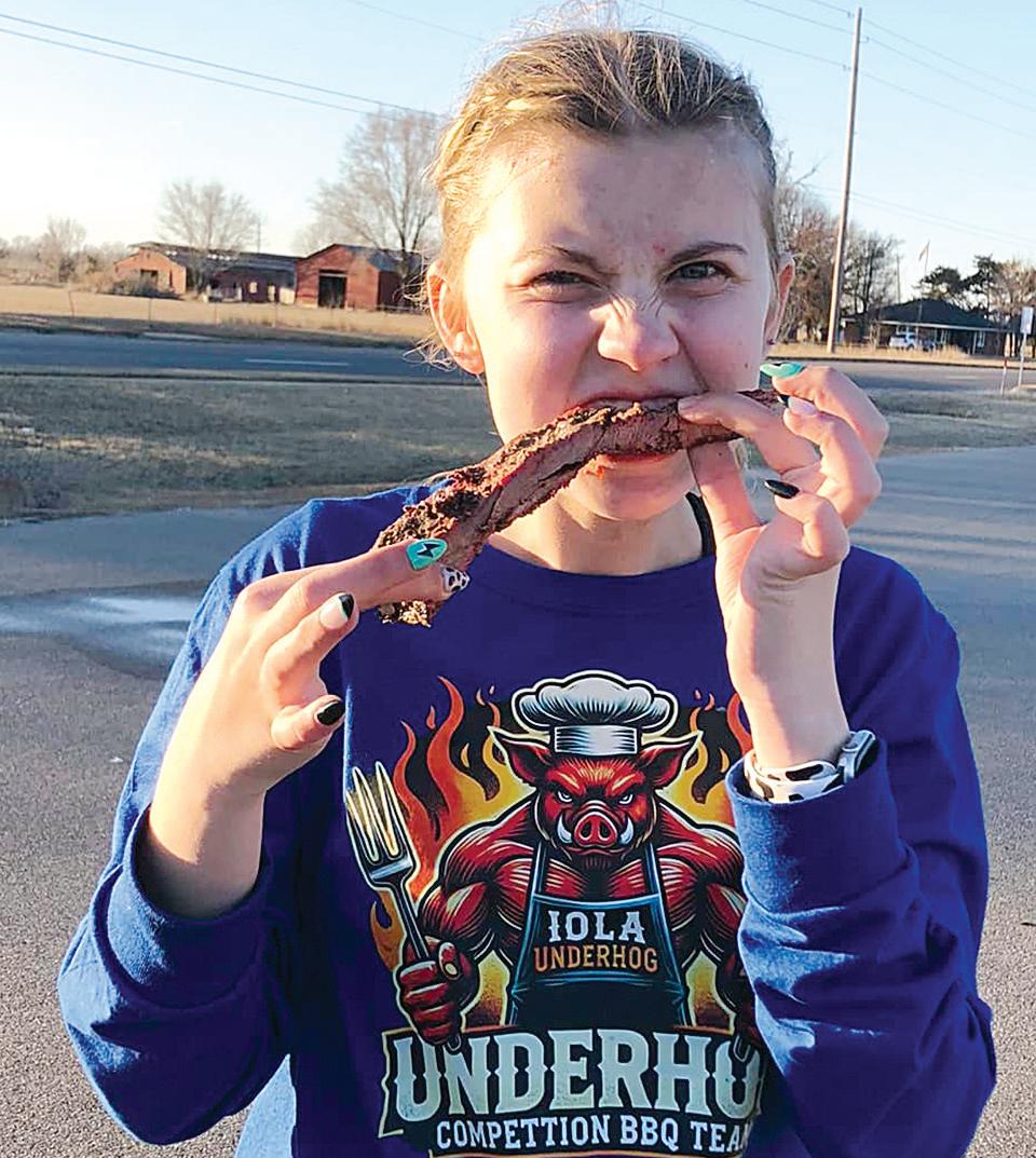 Iola Underhogs members Simon Mueller, from left, Franklin Kerr, Rohan Springer and Alston Nelson compete Saturday at the Kansas High School Barbecue Championships. At right, Iola’s Kenleigh Westhoff takes a bite of a cut of meat following the competition. PHOTOS COURTESY OF NICKI GOSSETT