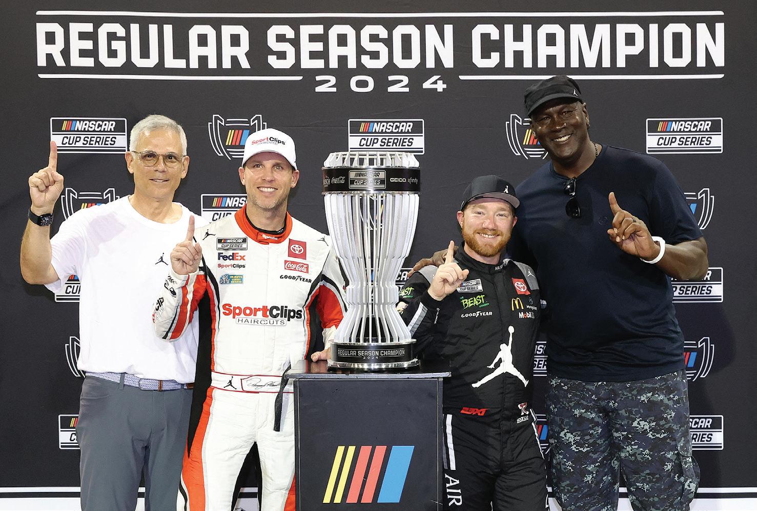 Regular Season Champion, Tyler Reddick, driver of the (45) Upper Deck Toyota, poses with Curtis Polk, 23XI Racing co-owners, NBA Hall of Famer, Michael Jordan, and Denny Hamlin, driver of the (11) Sport Clips Haircuts Toyota, after the NASCAR Cup Series Cook Out Southern 500 at Darlington Raceway on Sept. 01, 2024, in Darlington, South Carolina. TNS