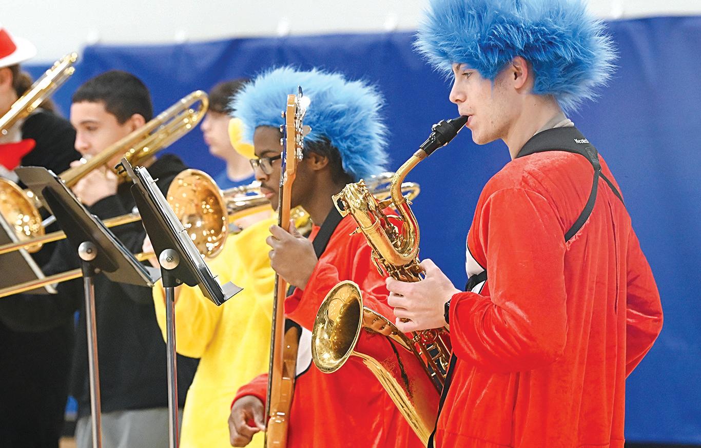 The Iola High School jazz band, performing as The Seuss Band, entertained Iola Elementary School students with a medley of tunes to start the day Thursday in honor of Dr. Seuss Week. Clockwise from top left, Bethany Miller donned a Cat in the Hat costume as she led the students in the flag salute; Kale Godfrey, from foreground, Kevon Loving and Raiden Stowell play a song; the rousing musical performance enticed the youngsters to sway back and forth before the performance ended with the IHS school fight song. REGISTER/ RICHARD LUKEN