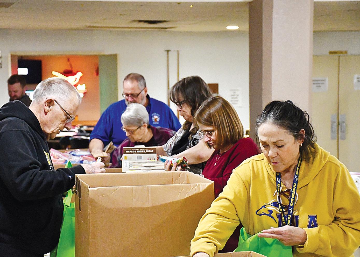 Iola Elks members fill bags with food to be handed out to students over the next several days