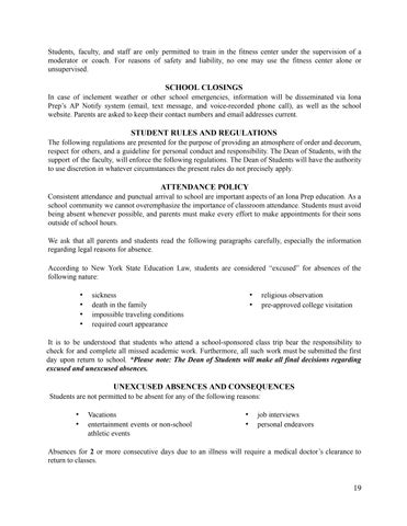 This handbook serves as an official source of school policies and requirements Itisessentialthatparents read and become familiar with the material contained within this booklet to support their sons’ efforts at Iona Prep in order to experience a very successfulhighschoolcareer Theschoolabidesbytheprovisions of the Buckley Amendment Non-custodial parents will be given access to academic records and informationregardingtheirchildrenunlessthereisacourtordertothecontrary.