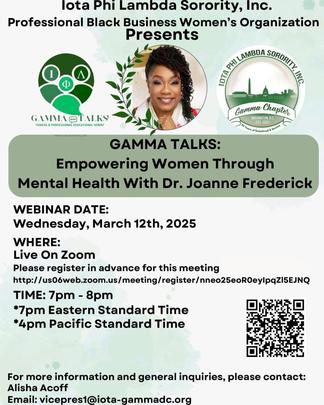 A mother of 3, a member of Alpha Kappa Alpha Sorority, Inc. and Iota Phi Lambda Sorority, Inc. -Zeta Mu chapter, Her motto is “Let’s Talk”. Gamma thanks Dr. Frederick with her work on presenting tools and techniques for managing our mental health in these days and times.