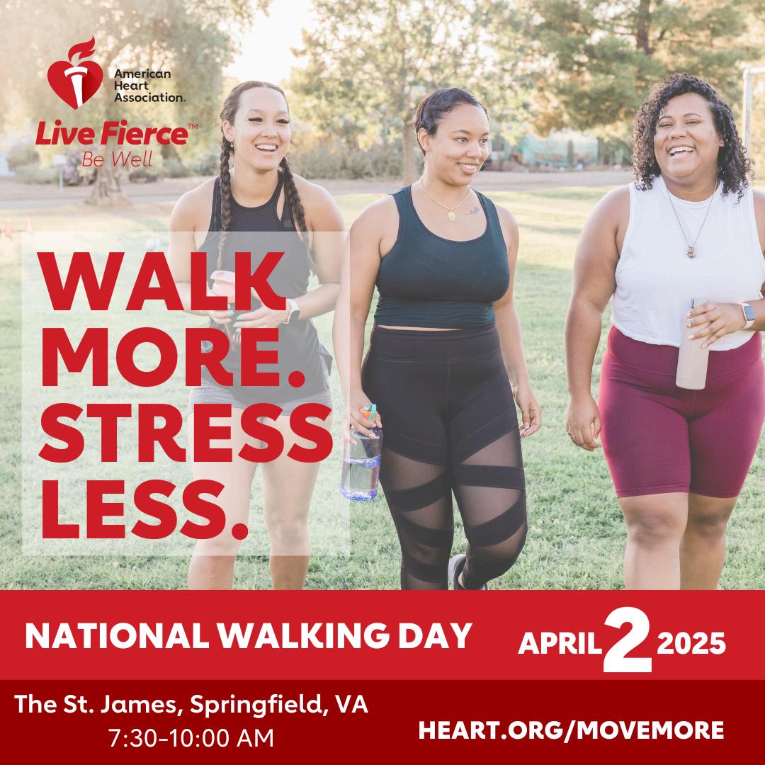 ThefirstWednesdayin AprilisNationalWalking Dayanditencourages Americansofallagesto getoutandstretchtheir legsandgettheirhearts pumping.