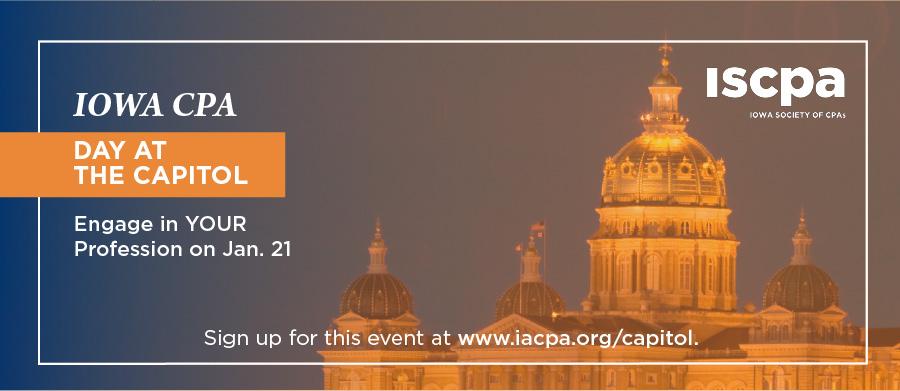To make the most of our day together and ensure every participant is prepared and informed, we will be hosting a virtual prep session ahead of the event date. No experience or knowledge of legislative activities is necessary. All are welcome to attend. Learn more about how decisions are made at the Capitol and the top issues ISCPA will be watching for this session. The more members involved in this event, the larger our impact. Get more information and sign up for this free event at www.iacpa.org/capitol.