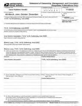 IOWA HOLSTEIN HERALD (USPS 024497) is published quarterly each year by the Iowa Holstein Association, P.O. Box 16, Guttenberg, IA 52052. The publication dates are March 1, June 1, October 1 and December 1. Periodical postage paid at Guttenberg, IA and additional offces. The deadline for submitting news and advertising copy is 30 days preceding publication date of issue.