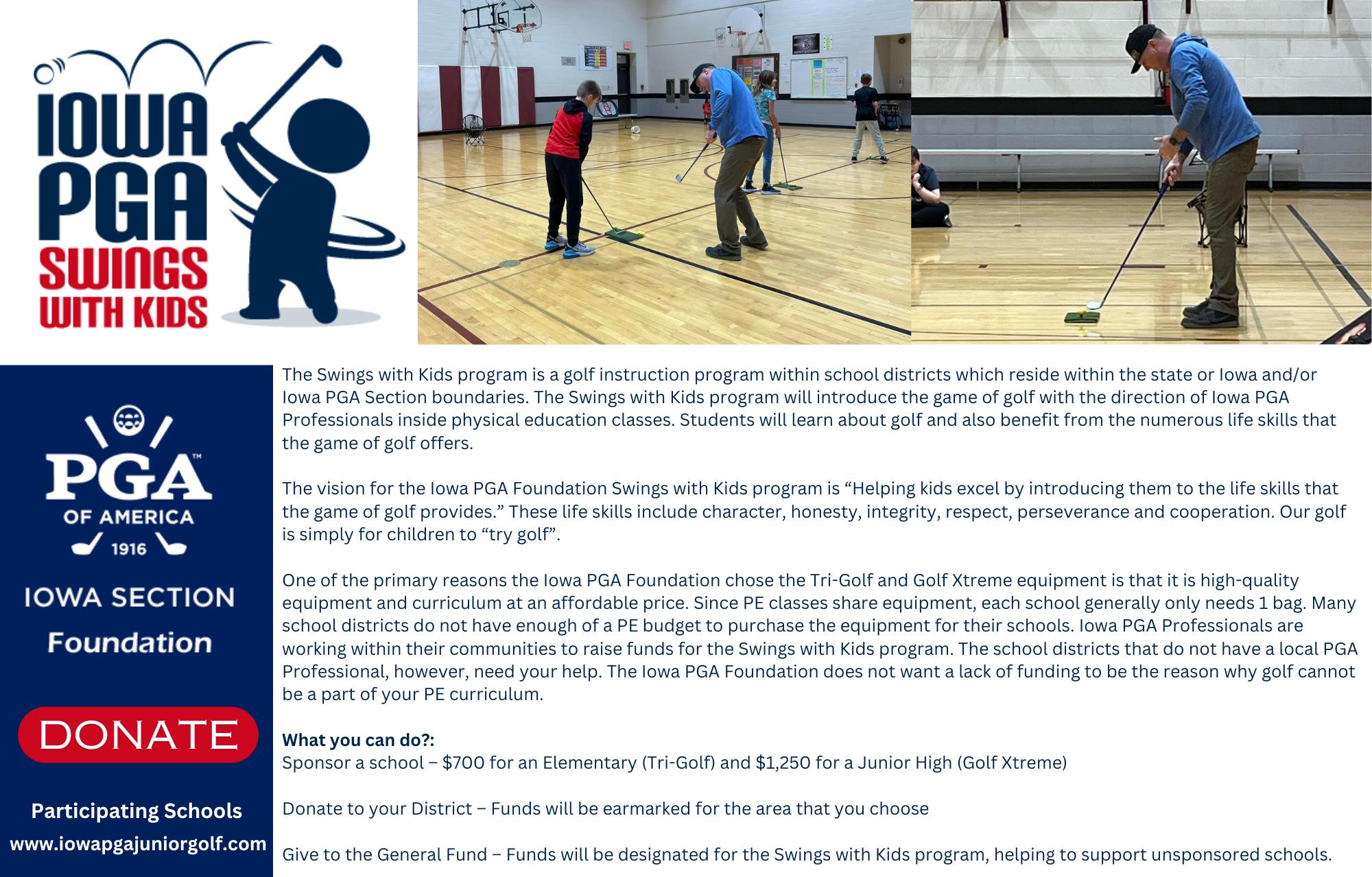 The Iowa PGA Foundation utilizes the game of golf to positively impact lives through charitable giving with emphasis on scholarships, junior golf and injured veterans.