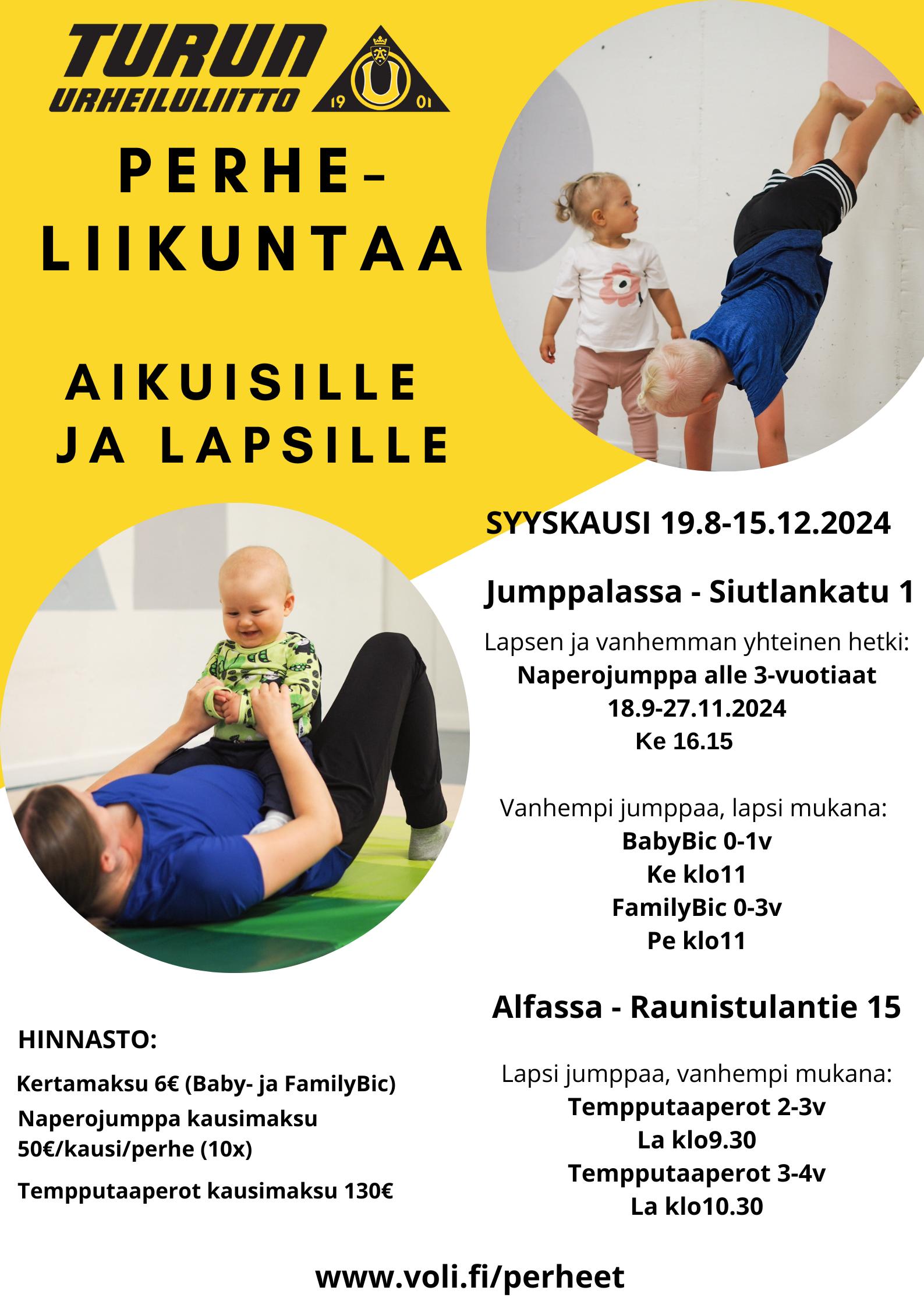 Turun Urheiluliiton Voimistelujaoston Jumppalan tunneilla pääsee koko perhe liikkumaan erilaisilla tunneilla. Vanhemmat saavat treenattua yhdessä vauvan kanssa BabyBic ja taaperoiden kanssa FamilyBic -tunneilla. Nelli Päivärinta sanoo, että ”on huippua, ettei tarvitse lapselle hoitopaikkaa oman treenin ajaksi”. Nelli käy FamilyBic tunnilla yhdessä puolitoistavuotiaan Maunon kanssa. Mauno käy välillä heittämässä palloa pieneen koriin ja konttaa tunnelin kautta takaisin katsomaan mitä liikkeitä äiti tekee. Joskus on kiva myös kiivetä selkään painoksi.