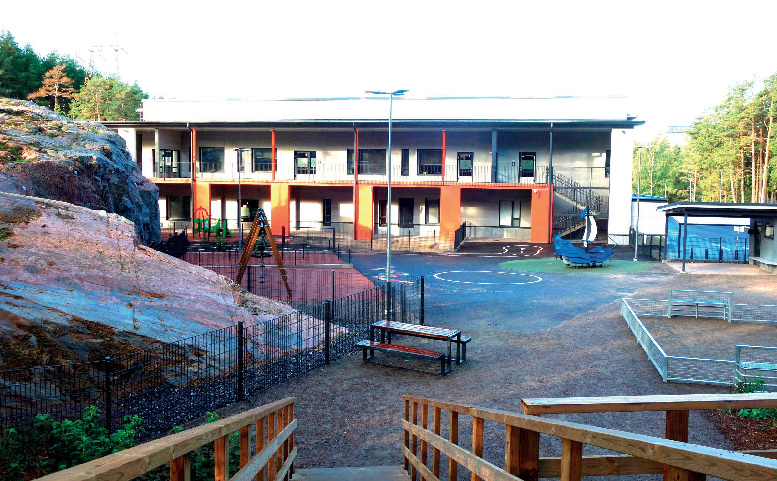 Suikkilan koulu- ja päiväkotitaloa ympäröi metsä ja kalliot