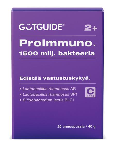 GutGuide®ProImmuno-bakteerilisä sisältää lasten Bifidobacterium lactis BLC1 ja Lactobacillus CRL1505 ja SP1-kannat, joilla suojataan sekä suolistoa että vahvistetaan koko kehon vastustuskykyä.