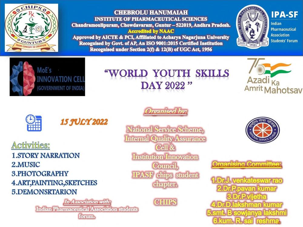 World youth skills day was celebrated on 15 July 2022 by IPA-SF chips student chapter & NSS Unit-I in association with Institute Innovation Council of Chebrolu Hananiah Institute of Pharmaceutical Sciences. We have organized several competitions like story narration, music, photography, Art, Painting, Demonstration to the students The students from 4th B.Pharmacy and 3rd B.Pharmacy and 2 nd B.Pharmacy and 2 nd and 3 rd pharm-d students were actively participated in the competitions About 110 students were participated in the events. Finally, the valedictory function was conducted at the end of programme., Dr S Vidyadhara Principal, attended the as Chief Guest for the occasion and gave a brief introduction about the significance of celebrating world youth skills day. At the end prizes were distributed to the students by Principal and staff members for the winners of events in the valedictory ceremony. The valedictory ceremony ended with the National Anthem.