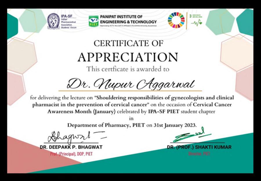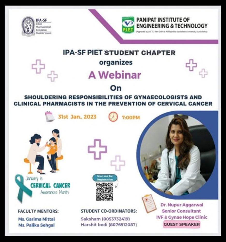 On 31st January 2023, 07:00 PM, as January month is dedicated as “Cervical Cancer Awareness Month” - A Perfect opportunity to spread awareness about HPV vaccination and the necessary precautions which a woman should take to prevent herself from the Cervical Cancer. So in that regard IPA-SF PIET STUDENT CHAPTER, on 31st January 2023, under the guidance of respected Dr Deepak Prabhakar Bhagwat Sir (Principal, Department of Pharmacy, PIET), Ms Palika Sehgal Mam and Ms. Garima Mittal Mam conducted an online Webinar.