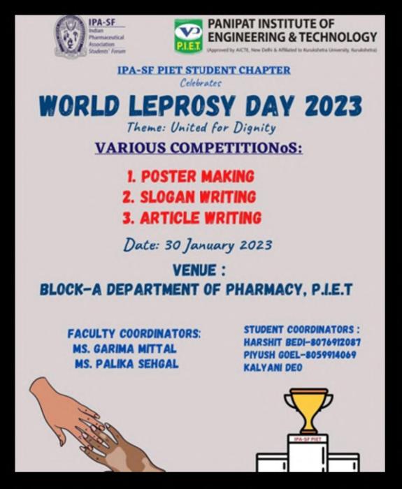 On 10th of January 2023, 10 AM onwards, IPA-SF PIET STUDENT CHAPTER celebrated 'World Leprosy Day' in PIET college campus. The theme of World Leprosy Day 2023 was “Act Now. End Leprosy”- keeping that in mind, they organized various competitions such as Poster making, Article writing and Slogan writing competition, in which the students of various departments showcased their active participation and gave their best.