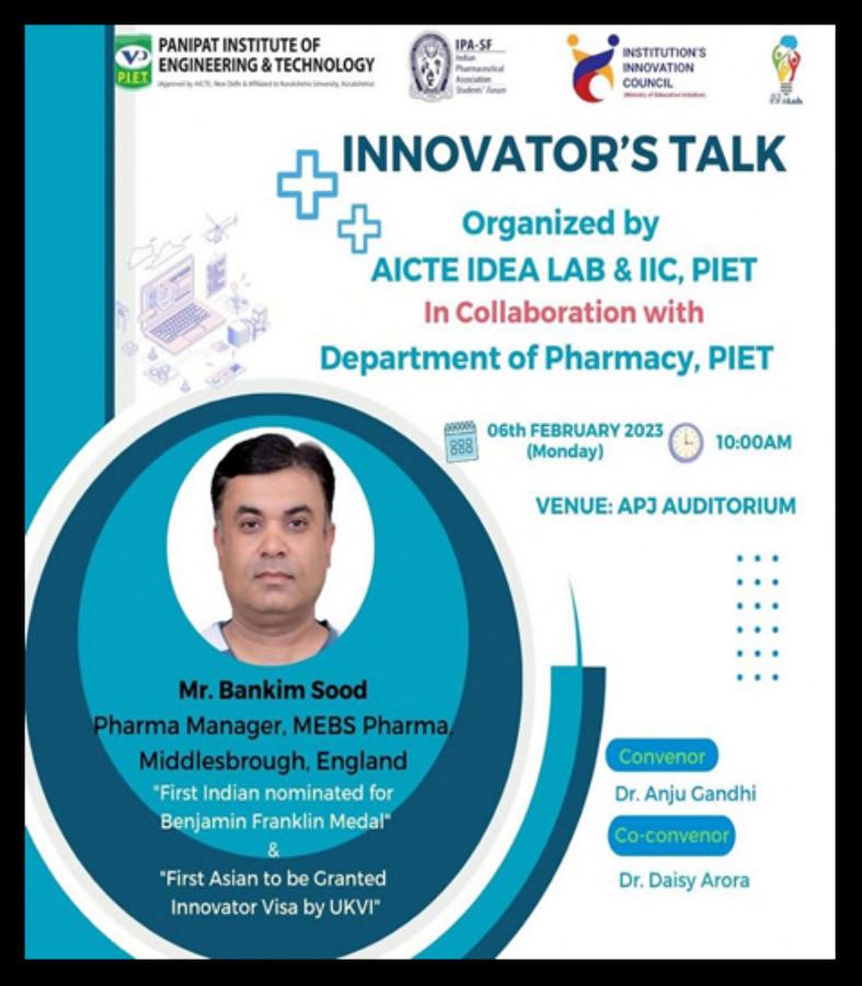On 6th February 2023, 10:00 AM, AICTE IDEA Lab and IIC, PIET in association with Department of Pharmacy, PIET organized an Innovator’s Talk by Mr. Bamkim Sood Sir (Pharma Manager, MEBS Pharma Middlesbrough, England) under the guidance of respected dignitaries’ viz. Dr. Shakti Kumar Sir (Director, PIET), Sh. Hari Om Tayal Sir (Chairman, PIET), Sh. Rakesh Tayal sir (ViceChairman PIET), Sh. Shubham Tayal Sir (Member BOG, PIET). The convenor’s for the event were Dr. Anju Gandhi Mam and Dr. Daisy Arora Mam.