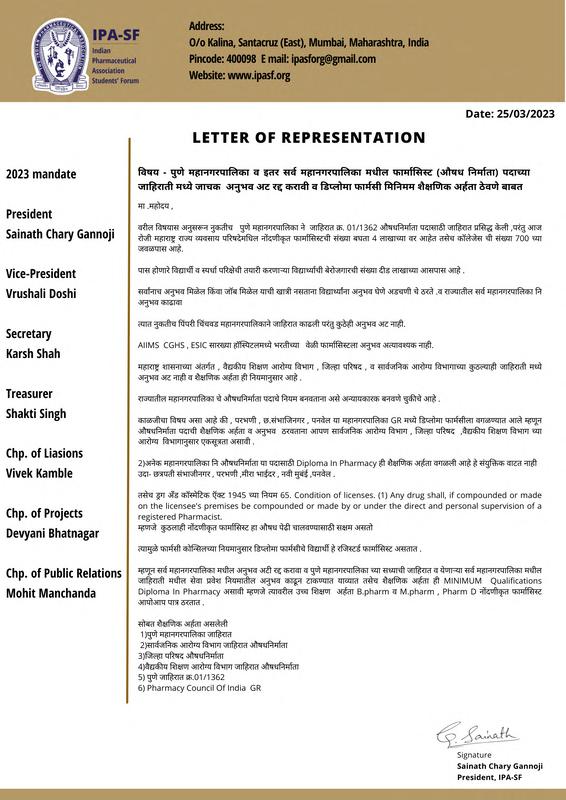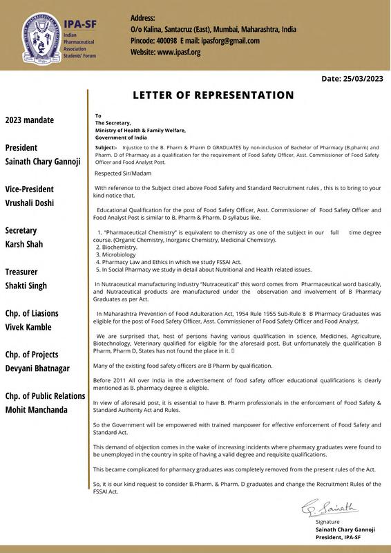 Under the Guidance and support of Mrs.Manjiri Gharat, Vice-President, IPA we team IPA-SF have submitted a representation about the issue of Injustice to the B Pharm & Pharm D GRADUATES by non-inclusion of Bachelor of Pharmacy (B.pharm) and Pharm. D of Pharmacy as a qualification for the requirement of Food Safety Officer, Asst. Commissioner of Food Safety Officer and Food Analyst Post to the Ministry of Health & Family Welfare, Government of India and Maharashtra State Government and requested to include the B Pharm & Pharm D as one of the eligible qualifications for the Food Safety Officer Recruitment.