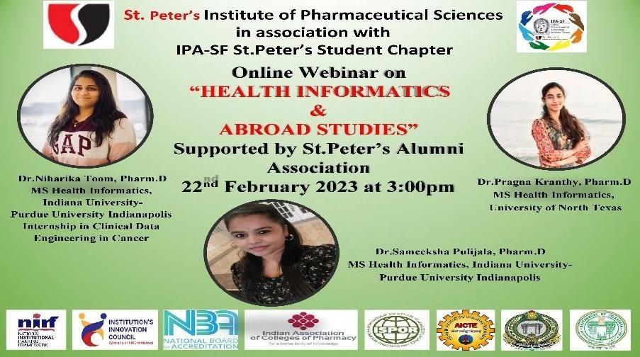 St. Peter’s Institute of pharmaceutical sciences in association with IPASF Organised an Interactive webinar on Health informatics and abroad studies on 22 February 2023, Where, Dr.Pragna Kranthy, who is currently pursuing an MS in health information technology at University of North Texas discussed various career opportunities In United states after pursuing pharmacy related courses in India. To put shortly, Master courses, Ph.D. courses available abroad and requirements for abroad education and eligibility criteria, Pharmacist License exams, List of Universities were discussed Dr Sameeksha Pulijala, who is currently pursuing an MS at the Indiana university of Indianapolis has given an overview of Challenges students may encounter while pursuing their career abroad. After that, Dr. Toom Niharika, who is currently pursuing her Internship in Clinical Data Engineering in cancer at Indiana University School of Medicine discussed Information technology in Health care and importance of choosing Health Informatics as a career option