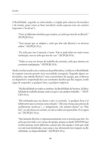A flexibilidade, segundo os entrevistados, é exigida pela natureza da temática e da missão, quase como se fosse inevitável, sendo expressa com um carácter imperativo (“ter de ser”): “Com as diferentes temáticas que existem, eu acho que terá de ser flexível.” (ECPCJ8.10.a). “Tem mesmo que se adaptar e acho que têm sido flexíveis e os técnicos sabem.” (ECPCJ1.10.a). “Eu acho que isso é inerente, é inato. Não se pode falar em inato numa instituição, mas eu acho que tem de o ser.” (ECPCJ8.10.b). “Todos os anos em termos de trabalho da comissão, acho que estamos em constante readaptação.” (ECPCJ6.10.b). Ainda correlacionado com a natureza da problemática, verifica-se a flexibilidade da resposta concreta perante uma necessidade emergente. Segundo alguns entrevistados, esta atitude flexível é uma característica da equipa, que evidencia ser disponível e empenhada face aos constantes desafios que lhe surgem, sendo capaz de responder, a qualquer hora, a qualquer exigência. “Há flexibilidade em todos os âmbitos: há flexibilidade de horários, há flexibilidade de trabalho porque cada um gere o seu próprio trabalho...” (ECPCJ14.10.a). “Há instituições que nos dizem a nós e à comissão, “a qualquer hora é só telefonarem que se arranja (uma solução)”. Há uma criança que precisa de acolhimento, resolve-se (...). Antigamente, “ah, estamos cheios!” ou “Não há!”, ou não havia um contato, ou não se sabia com quem falar. E eu agora sei.” (ECPCJ11.10.a). “São bastante flexíveis e impressionantemente com os recursos que têm. Eu acho que tem tudo a ver a força da equipa, porque eu desde 2004/2008 que conheci pessoas muito diferentes a passar por esta equipa e sinto que cada vez está mais fortalecida, mais coesa e isso obviamente tem impacto na flexibilidade, na disponibilidade.” (ECPCJ16.10.a). 98