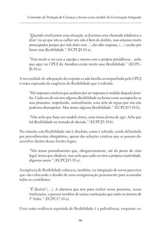 “Quando sinalizamos uma situação, se fizermos uma chamada telefónica a dizer ‘eu sei que isto se calhar isto não é bem do âmbito, mas estamos muito preocupados porque por trás disto vem...’, eles dão resposta, (…) acaba por haver essa flexibilidade.” (ECPCJ4.10.a). “Tem muito a ver com a equipa e mesmo com a própria presidência... acho que aqui na CPCJ da Amadora existe muito essa flexibilidade.” (ECPCJ6.10.a). A necessidade de adequação da resposta a cada família acompanhada pela CPCJ é outra expressão da exigência de flexibilidade que é referida: “Há respostas criativas que acabam por ser respostas à medida daquela família. Cada um de nós tem alguma flexibilidade na forma como acompanha os seus processos, respeitando, naturalmente, uma série de regras que nós não podemos desrespeitar. Mas temos alguma flexibilidade.” (ECPCJ13.10.b). “Não acho que haja um modelo único, uma única forma de agir. Acho que há flexibilidade na tomada de decisão.” (ECPCJ3.10.b). No entanto, esta flexibilidade não é absoluta, como é referido, sendo delimitada por procedimentos obrigatórios, apesar das soluções criativas que se possam desenvolver dentro desses limites legais: “Nós temos procedimentos que, obrigatoriamente, até do ponto de vista legal, temos que obedecer, mas acho que cada um tem a própria criatividade, digamos assim.” (ECPCJ13.10.a). A exigência de flexibilidade coloca-se, também, na integração de novos parceiros que vão colocando o desafio de uma reorganização permanente para acomodar todos os contributos: “É flexível (…). A abertura que tem para incluir novos parceiros, novas instituições, o parecer também de outras instituições que estão no terreno de 1ª linha.” (ECPC17.10.a). Uma outra evidência reportada de flexibilidade é a polivalência, enquanto ca99