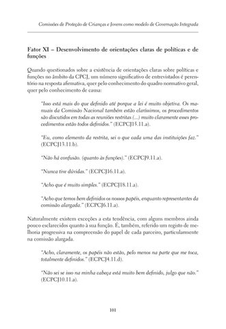 Fator XI – Desenvolvimento de orientações claras de políticas e de funções Quando questionados sobre a existência de orientações claras sobre políticas e funções no âmbito da CPCJ, um número significativo de entrevistados é perentório na resposta afirmativa, quer pelo conhecimento do quadro normativo geral, quer pelo conhecimento de causa: “Isso está mais do que definido até porque a lei é muito objetiva. Os manuais da Comissão Nacional também estão claríssimos, os procedimentos são discutidos em todas as reuniões restritas (...) muito claramente esses procedimentos estão todos definidos.” (ECPCJ15.11.a). “Eu, como elemento da restrita, sei o que cada uma das instituições faz.” (ECPCJ13.11.b). “Não há confusão. (quanto às funções).” (ECPCJ9.11.a). “Nunca tive dúvidas.” (ECPCJ16.11.a). “Acho que é muito simples.” (ECPCJ18.11.a). “Acho que temos bem definidos os nossos papéis, enquanto representantes da comissão alargada.” (ECPCJ6.11.a). Naturalmente existem exceções a esta tendência, com alguns membros ainda pouco esclarecidos quanto à sua função. É, também, referido um registo de melhoria progressiva na compreensão do papel de cada parceiro, particularmente na comissão alargada. “Acho, claramente, os papéis não estão, pelo menos na parte que me toca, totalmente definidos.” (ECPCJ4.11.d). “Não sei se isso na minha cabeça está muito bem definido, julgo que não.” (ECPCJ10.11.a).