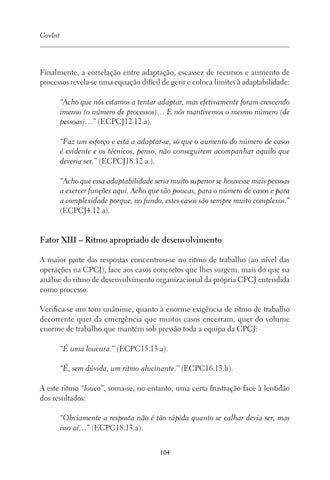 Fator XIII – Ritmo apropriado de desenvolvimento A maior parte das respostas concentrou-se no ritmo de trabalho (ao nível das operações na CPCJ), face aos casos concretos que lhes surgem, mais do que na análise do ritmo de desenvolvimento organizacional da própria CPCJ entendida como processo. Verifica-se um tom unânime, quanto à enorme exigência de ritmo de trabalho decorrente quer da emergência que muitos casos encerram, quer do volume enorme de trabalho que mantém sob pressão toda a equipa da CPCJ: “É uma loucura.” (ECPC15.13.a). “É, sem dúvida, um ritmo alucinante.” (ECPC16.13.b). A este ritmo “louco”, soma-se, no entanto, uma certa frustração face à lentidão dos resultados: “Obviamente a resposta não é tão rápida quanto se calhar devia ser, mas isso aí…” (ECPC18.13.a). 104