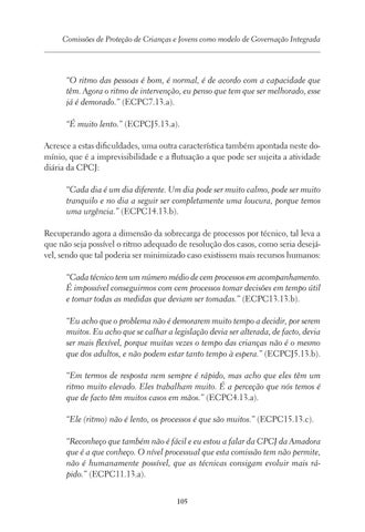 “O ritmo das pessoas é bom, é normal, é de acordo com a capacidade que têm. Agora o ritmo de intervenção, eu penso que tem que ser melhorado, esse já é demorado.” (ECPC7.13.a). “É muito lento.” (ECPCJ5.13.a). Acresce a estas dificuldades, uma outra característica também apontada neste domínio, que é a imprevisibilidade e a flutuação a que pode ser sujeita a atividade diária da CPCJ: “Cada dia é um dia diferente. Um dia pode ser muito calmo, pode ser muito tranquilo e no dia a seguir ser completamente uma loucura, porque temos uma urgência.” (ECPC14.13.b). Recuperando agora a dimensão da sobrecarga de processos por técnico, tal leva a que não seja possível o ritmo adequado de resolução dos casos, como seria desejável, sendo que tal poderia ser minimizado caso existissem mais recursos humanos: “Cada técnico tem um número médio de cem processos em acompanhamento. É impossível conseguirmos com cem processos tomar decisões em tempo útil e tomar todas as medidas que deviam ser tomadas.” (ECPC13.13.b). “Eu acho que o problema não é demorarem muito tempo a decidir, por serem muitos. Eu acho que se calhar a legislação devia ser alterada, de facto, devia ser mais flexível, porque muitas vezes o tempo das crianças não é o mesmo que dos adultos, e não podem estar tanto tempo à espera.” (ECPCJ5.13.b). “Em termos de resposta nem sempre é rápido, mas acho que eles têm um ritmo muito elevado. Eles trabalham muito. É a perceção que nós temos é que de facto têm muitos casos em mãos.” (ECPC4.13.a). “Ele (ritmo) não é lento, os processos é que são muitos.” (ECPC15.13.c). “Reconheço que também não é fácil e eu estou a falar da CPCJ da Amadora que é a que conheço. O nível processual que esta comissão tem não permite, não é humanamente possível, que as técnicas consigam evoluir mais rápido.” (ECPC11.13.a). 105