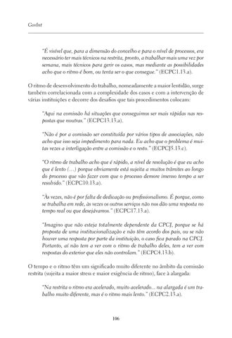 “É visível que, para a dimensão do concelho e para o nível de processos, era necessário ter mais técnicos na restrita, pronto, a trabalhar mais uma vez por semana, mais técnicos para gerir os casos, mas mediante as possibilidades acho que o ritmo é bom, ou tenta ser o que consegue.” (ECPC1.13.a). O ritmo de desenvolvimento do trabalho, nomeadamente a maior lentidão, surge também correlacionada com a complexidade dos casos e com a intervenção de várias instituições e decorre dos desafios que tais procedimentos colocam: “Aqui na comissão há situações que conseguimos ser mais rápidas nas respostas que noutras.” (ECPC13.13.a). “Não é por a comissão ser constituída por vários tipos de associações, não acho que isso seja impedimento para nada. Eu acho que o problema é muitas vezes a interligação entre a comissão e o resto.” (ECPCJ5.13.c). “O ritmo de trabalho acho que é rápido, a nível de resolução é que eu acho que é lento (…) porque obviamente está sujeita a muitos trâmites ao longo do processo que vão fazer com que o processo demore imenso tempo a ser resolvido.” (ECPC10.13.a). “Às vezes, não é por falta de dedicação ou profissionalismo. É porque, como se trabalha em rede, às vezes os outros serviços não nos dão uma resposta no tempo real ou que desejávamos.” (ECPC17.13.a). “Imagino que não esteja totalmente dependente da CPCJ, porque se há proposta de uma institucionalização e não têm acordo dos pais, ou se não houver uma resposta por parte da instituição, o caso fica parado na CPCJ. Portanto, aí não tem a ver com o ritmo de trabalho deles, tem a ver com respostas do exterior que eles não controlam.” (ECPC4.13.b). O tempo e o ritmo têm um significado muito diferente no âmbito da comissão restrita (sujeita a maior stress e maior exigência de ritmo), face à alargada: “Na restrita o ritmo era acelerado, muito acelerado... na alargada é um trabalho muito diferente, mas é o ritmo mais lento.” (ECPC2.13.a).
