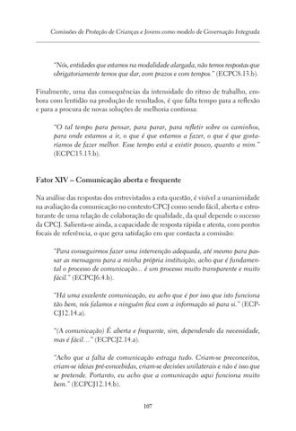 Fator XIV – Comunicação aberta e frequente Na análise das respostas dos entrevistados a esta questão, é visível a unanimidade na avaliação da comunicação no contexto CPCJ como sendo fácil, aberta e estruturante de uma relação de colaboração de qualidade, da qual depende o sucesso da CPCJ. Salienta-se ainda, a capacidade de resposta rápida e atenta, com pontos focais de referência, o que gera satisfação em que contacta a comissão: “Para conseguirmos fazer uma intervenção adequada, até mesmo para passar as mensagens para a minha própria instituição, acho que é fundamental o processo de comunicação... é um processo muito transparente e muito fácil.” (ECPCJ6.4.b). “Há uma excelente comunicação, eu acho que é por isso que isto funciona tão bem, nós falamos e ninguém fica com a informação só para si.” (ECPCJ12.14.a). “(A comunicação) É aberta e frequente, sim, dependendo da necessidade, mas é fácil…” (ECPCJ2.14.a). “Acho que a falta de comunicação estraga tudo. Criam-se preconceitos, criam-se ideias pré-concebidas, criam-se decisões unilaterais e não é isso que se pretende. Portanto, eu acho que a comunicação aqui funciona muito bem.” (ECPCJ12.14.b). 107