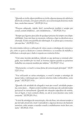 “Quando eu tenho algum problema eu tenho algumas pessoas de referência dentro da comissão, com quem articulo e aí a comunicação funciona muito bem, muito bem mesmo.” (ECPCJ4.14.a). “Processo adequado, rápido, fácil, normalmente também é sempre por e-mail, contato telefónico…sem interferências…” (ECPCJ6.14.a). “Sempre que ligamos para falar de qualquer processo há sempre uma disponibilidade. Caso não haja no momento, voltamos a ligar ou devolvem-nos a chamada. Existe uma partilha de informação. E eu penso que a comunicação seja boa.” (ECPCJ1.14.a.). Os entrevistados referem a utilização de vários canais e estratégias de comunicação, entre os quais se destacam o correio eletrónico e as reuniões de trabalho e sublinham a atenção que é dada à resposta aos contactos feitos: “Com estas reuniões periódicas, falando eu que pertenço a comissão alargada, mas também por via mail, se tivermos alguma questão ou quisermos trabalhar em conjunto também por telefone.” (ECPCJ17.14.a). “Diariamente, o e-mail é a nossa forma de comunicação principal.” (ECPCJ13.14.a). “Vou utilizando as várias estratégias, o e-mail é sempre a estratégia de passar toda a informação que é preciso estarmos todos conhecedores, como grupo.” (ECPCJ15.14.b). “Quando é de atividade da alargada é mais por e-mail: atividades propostas, como fazer,… Depois existem também reuniões que são calendarizadas quinzenal ou mensalmente. Quando são situações específicas da restrita, isso aí ligam, é mais contacto direto, ou até às vezes fazemos uma visita conjunta.” (ECPCJ18.14.a). “A nível de estratégias de comunicação, elas são boas, nós estamos sempre a par de tudo através de e-mail. A presidente e algumas técnicas são bastante acessíveis, estão sempre a mandar e-mails e estabelecemos muito bem contacto.” (ECPCJ1.14.d). 108