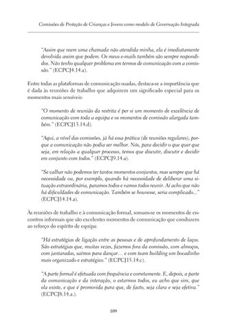“Assim que veem uma chamada não atendida minha, ela é imediatamente devolvida assim que podem. Os meus e-mails também são sempre respondidos. Não tenho qualquer problema em termos de comunicação com a comissão.” (ECPCJ4.14.a). Entre todas as plataformas de comunicação usadas, destaca-se a importância que é dada às reuniões de trabalho que adquirem um significado especial para os momentos mais sensíveis: “O momento de reunião da restrita é per si um momento de excelência de comunicação com toda a equipa e os momentos de comissão alargada também.” (ECPCJ13.14.d). “Aqui, a nível das comissões, já há essa prática (de reuniões regulares), porque a comunicação não podia ser melhor. Nós, para decidir o que quer que seja, em relação a qualquer processo, temos que discutir, discutir e decidir em conjunto com todos.” (ECPCJ9.14.a). “Se calhar não podemos ter tantos momentos conjuntos, mas sempre que há necessidade ou, por exemplo, quando há necessidade de deliberar uma situação extraordinária, paramos todos e vamos todos reunir. Aí acho que não há dificuldades de comunicação. Também se houvesse, seria complicado...” (ECPCJ14.14.a). Às reuniões de trabalho e à comunicação formal, somam-se os momentos de encontros informais que são excelentes momentos de comunicação que conduzem ao reforço do espírito de equipa: “Há estratégias de ligação entre as pessoas e de aprofundamento de laços. São estratégias que, muitas vezes, fazemos fora da comissão, com almoços, com jantaradas, saímos para dançar… e com team building um bocadinho mais organizado e estratégico.” (ECPCJ15.14.c). “A parte formal é efetuada com frequência e corretamente. E, depois, a parte da comunicação e da interação, o estarmos todos, eu acho que sim, que ela existe, e que é promovida para que, de facto, seja clara e seja efetiva.” (ECPCJ8.14.a.). 109