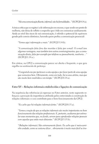 Fator XV – Relações informais estabelecidas e ligações de comunicação Na sequência das referências já expressas no Fator anterior, neste segmento reforça-se a perceção da importância atribuída pelos entrevistados à construção de relações informais e o seu contributo para o bom funcionamento da CPCJ: “Eu acho que há relações informais fortes.” (ECPCJ18.15.a). “Temos a noção de que as relações informais são muito importantes no bom funcionamento das relações profissionais. E, portanto, acabamos por estimular esses momentos que, no fundo, servem para aprofundar relações pessoais com aquelas que estão mais distantes.” (ECPCJ13.15.b). “(Relações informais) São extremamente fáceis. Eu acho que é meio-caminho andado, como se costuma dizer... obviamente é muito mais fácil se tive110