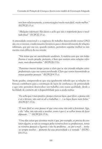 rem bom relacionamento, a comunicação é muito mais fácil, muito melhor.” (ECPCJ5.15.a). “(Relações informais) São fáceis e acho que isso é importante para o resultado final.” (ECPCJ2.15.a). A intensidade emocional e a exigência do trabalho desenvolvido numa CPCJ são, em si mesmo, condicionantes favoráveis para o desenvolvimento de relações informais, que por sua vez, quando existem, permitem suportar melhor os momentos mais difíceis da sua missão: “Nós temos que ser mentalmente saudáveis. A matéria com que nós trabalhamos é muito pesada, portanto, é bom que existam estas relações informais, mais descontraídas.” (ECPCJ8.15.b). “Passamos imenso tempo juntas e claro que se vão criando relações extraprofissionais e que nos vamos envolvendo. Claro que vamos transmitindo as nossas questões pessoais.” (ECPCJ14.15.a). Neste quadro, compreende-se que seja igualmente referido que as relações informais contribuem para a construção de laços de confiança e de proximidade e que estes permitem desenvolver um trabalho com maior qualidade, desde a facilidade de contacto até à disponibilidade para a ajuda mútua: “Eu acho que é mais positivo, porque criam-se laços, quer dizer, a pessoa não é só o técnico, não está só ali a trabalhar, (...) os laços ficam mais fortes.” (ECPCJ17.15.b). “É mais fácil se uma pessoa vê que uma coisa não está a funcionar, liga, e diz “olha, isto não está a resultar, como é que é, se calhar temos de fazer diferente...”.” (ECPCJ18.15.b). “Uma das coisas que acontece muito é que, por exemplo, se precisa de contatar alguém, se não se consegue pelos números fixos ou profissionais, temos os números pessoais e ligamos e não há problema…ou por e-mail… tenta-se sempre resolver… portanto há essa proximidade e à vontade.” (ECPCJ16.15.a). 111
