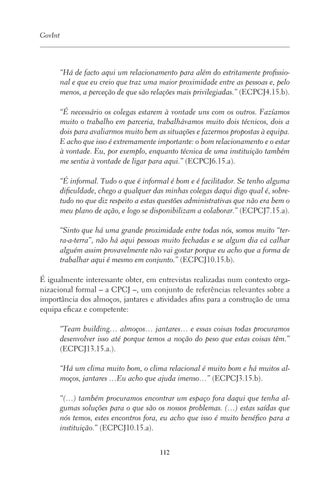 “Há de facto aqui um relacionamento para além do estritamente profissional e que eu creio que traz uma maior proximidade entre as pessoas e, pelo menos, a perceção de que são relações mais privilegiadas.” (ECPCJ4.15.b). “É necessário os colegas estarem à vontade uns com os outros. Fazíamos muito o trabalho em parceria, trabalhávamos muito dois técnicos, dois a dois para avaliarmos muito bem as situações e fazermos propostas à equipa. E acho que isso é extremamente importante: o bom relacionamento e o estar à vontade. Eu, por exemplo, enquanto técnica de uma instituição também me sentia à vontade de ligar para aqui.” (ECPCJ6.15.a). “É informal. Tudo o que é informal é bom e é facilitador. Se tenho alguma dificuldade, chego a qualquer das minhas colegas daqui digo qual é, sobretudo no que diz respeito a estas questões administrativas que não era bem o meu plano de ação, e logo se disponibilizam a colaborar.” (ECPCJ7.15.a). “Sinto que há uma grande proximidade entre todas nós, somos muito “terra-a-terra”, não há aqui pessoas muito fechadas e se algum dia cá calhar alguém assim provavelmente não vai gostar porque eu acho que a forma de trabalhar aqui é mesmo em conjunto.” (ECPCJ10.15.b). É igualmente interessante obter, em entrevistas realizadas num contexto organizacional formal – a CPCJ –, um conjunto de referências relevantes sobre a importância dos almoços, jantares e atividades afins para a construção de uma equipa eficaz e competente: “Team building… almoços… jantares… e essas coisas todas procuramos desenvolver isso até porque temos a noção do peso que estas coisas têm.” (ECPCJ13.15.a.). “Há um clima muito bom, o clima relacional é muito bom e há muitos almoços, jantares …Eu acho que ajuda imenso…” (ECPCJ3.15.b). “(…) também procuramos encontrar um espaço fora daqui que tenha algumas soluções para o que são os nossos problemas. (…) estas saídas que nós temos, estes encontros fora, eu acho que isso é muito benéfico para a instituição.” (ECPCJ10.15.a). 112