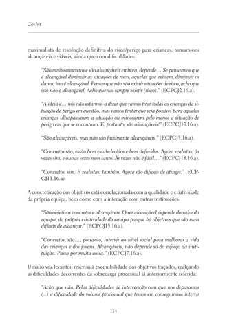 maximalista de resolução definitiva do risco/perigo para crianças, tornam-nos alcançáveis e viáveis, ainda que com dificuldades: “São muito concretos e são alcançáveis embora, depende… Se pensarmos que é alcançável diminuir as situações de risco, aquelas que existem, diminuir os danos, isso é alcançável. Pensar que não vão existir situações de risco, acho que isso não é alcançável. Acho que vai sempre existir (risco).” (ECPCJ2.16.a). “A ideia é… nós não estarmos a dizer que vamos tirar todas as crianças da situação de perigo em questão, mas vamos tentar que seja possível para aquelas crianças ultrapassarem a situação ou minorarem pelo menos a situação de perigo em que se encontram. E, portanto, são alcançáveis!” (ECPCJ13.16.a). “São alcançáveis, mas não são facilmente alcançáveis.” (ECPCJ5.16.a). “Concretos são, estão bem estabelecidos e bem definidos. Agora realistas, às vezes sim, e outras vezes nem tanto. Às vezes não é fácil…” (ECPCJ18.16.a). “Concretos, sim. E realistas, também. Agora são difíceis de atingir.” (ECPCJ11.16.a). A concretização dos objetivos está correlacionada com a qualidade e criatividade da própria equipa, bem como com a interação com outras instituições: “São objetivos concretos e alcançáveis. O ser alcançável depende do valor da equipa, da própria criatividade da equipa porque há objetivos que são mais difíceis de alcançar.” (ECPCJ15.16.a). “Concretos, são…, portanto, intervir ao nível social para melhorar a vida das crianças e dos jovens. Alcançáveis, não depende só do esforço da instituição. Passa por muita coisa.” (ECPCJ7.16.a). Uma só voz levantou reservas à exequibilidade dos objetivos traçados, realçando as dificuldades decorrentes da sobrecarga processual já anteriormente referida: “Acho que não. Pelas dificuldades de intervenção com que nos deparamos (...) a dificuldade do volume processual que temos em conseguirmos intervir 114