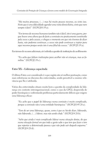 Fator XX – Liderança capacitada O último Fator a ser considerado é o que regista não só melhor pontuação, como mais referências no discurso dos entrevistados, sendo percetível a enorme relevância que lhe é atribuída. Vários dos entrevistados situam muito bem a questão da complexidade da liderança em contexto interorganizacional, como o caso da CPCJ, desprovida de poder hierárquico e enfrentando problemas particularmente difíceis que exigem uma liderança eficaz: “Eu acho que o papel de liderança numa comissão é muito complicado, porque a comissão não é uma entidade hierárquica.” (ECPCJ1145.20.a). “Tem de ser uma liderança, quase, como é que eu hei-de dizer, liderando, não liderando, (…) liderar, mas não sendo chefe.” (ECPCJ14.20.b). “Acho que ainda é mais complicado liderar numa situação destas, do que numa situação formal em que toda a gente sabe o que tem que fazer e tem que reportar a determinada pessoa e que não pode sair daquele esquema.” (ECPCJ14.20.d). 119