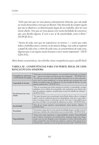 “Tinha que ser uma pessoa expressiva, com uma fácil comunicação, um bocadinho… agora só me surge uma palavra que não é adequada…” (ECPCJ6.20.b). “Eu acho que tem de ter esta capacidade relacional com os vários elementos, ouvir, ouvir as várias tendências e as várias opiniões que as pessoas têm, mas depois ser também capaz de influenciar, de uma tomada de decisão, ter uma opinião também forte.” (ECPCJ5.20.e). “Deve ser uma pessoa que tenha interesse em envolver a comunidade e consiga estabelecer com os líderes da comunidade e das instituições uma relação também de confiança, respeito e sensibilização em prol do trabalho da comissão.” (ECPCJ13.20.e). “Ser capaz de passar uma comunicação muito fluida, direta e eficaz, e conseguir apelar e motivar os diferentes parceiros à participação. Acho que o mais importante é conseguir cativar os outros para um fim. Isso é que é o mais difícil, isso é que torna um líder, é ter esse poder de influenciar os outros.” (ECPCJ18.20.b).