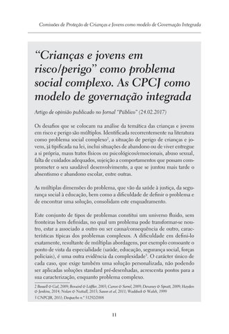 “Crianças e jovens em risco/perigo” como problema social complexo. As CPCJ como modelo de governação integrada Artigo de opinião publicado no Jornal “Público” (24.02.2017) Os desafios que se colocam na análise da temática das crianças e jovens em risco e perigo são múltiplos. Identificada recorrentemente na literatura como problema social complexo2, a situação de perigo de crianças e jovens, já tipificada na lei, inclui situações de abandono ou de viver entregue a si própria, maus tratos físicos ou psicológicos/emocionais, abuso sexual, falta de cuidados adequados, sujeição a comportamentos que possam comprometer o seu saudável desenvolvimento, a que se juntou mais tarde o absentismo e abandono escolar, entre outras. As múltiplas dimensões do problema, que vão da saúde à justiça, da segurança social à educação, bem como a dificuldade de definir o problema e de encontrar uma solução, consolidam este enquadramento. Este conjunto de tipos de problemas constitui um universo fluido, sem fronteiras bem definidas, no qual um problema pode transformar-se noutro, estar a associado a outro ou ser causa/consequência de outro, características típicas dos problemas complexos. A dificuldade em defini-lo exatamente, resultante de múltiplas abordagens, por exemplo consoante o ponto de vista da especialidade (saúde, educação, segurança social, forças policiais), é uma outra evidência da complexidade3. O carácter único de cada caso, que exige também uma solução personalizada, não podendo ser aplicadas soluções standard pré-desenhadas, acrescenta pontos para a sua caracterização, enquanto problema complexo. 2 Bessell & Gal, 2009; Bovaird & Löffler, 2003; Caron & Serrel, 2009; Devaney & Spratt, 2009; Hayden & Jenkins, 2014; Nolan & Nuttall, 2013; Sason et al, 2011; Waddock & Walsh, 1999 3 CNPCJR, 2011; Despacho n.º 31292/2008