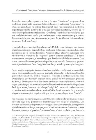 A concluir, uma palavra para a relevância do tema “Confiança” no quadro deste modelo de governação integrada. São múltiplas as referências à “Confiança” no estudo de caso. Quer na análise documental, quer nas entrevistas, é evidente a importância que lhe é atribuída. Uma das expressões mais fortes, decorre de ser considerado pelos entrevistados que a “Confiança” é condição essencial para que este modelo funcione, sendo que também estas vozes reconhecem que se trata de um caminho, em que, muitas vezes, o ponto de partida é de baixa confiança ou mesmo de desconfiança. O modelo de governação integrada numa CPCJ deve ser visto com um sistema interativo, dinâmico e dependente de confiança. Esta surge como condição obrigatória para que o sistema funcione. Nesse sentido, é plausível a analogia comparativa com a relevância do “oxigénio” para os sistemas aeróbicos33. Tal como acontece com o oxigénio, é a confiança que dá vida e vitalidade ao sistema. Caso exista, permite-lhe desempenhos adequados, mas, quando desaparece, provoca a extinção do sistema. Sem “oxigénio”/confiança, não há governação integrada. Nesse sentido, o próprio sistema, através desses fatores críticos de sucesso (liderança, comunicação, participação e avaliação adequadas) e das suas interações, quando funciona bem, produz “oxigénio”, tornando o contexto cada vez mais favorável para que funcione melhor, numa espiral positiva (retroação positiva). Ao invés, a disfunção ao nível dos fatores críticos de sucesso (liderança, comunicação, participação ou monitorização/avaliação inexistentes ou desadequadas) e das frágeis interações entre eles, dissipa “oxigénio”, que se vai rarefazendo cada vez mais e vai tornando cada vez mais difícil o funcionamento da governação integrada, numa espiral negativa, até que pode mesmo chegar à sua “morte”. Esta realidade é dinâmica e, consequentemente, pode mudar ao longo do tempo, pelo que exige uma permanente monitorização dos níveis de confiança. Um processo colaborativo de governação integrada pode, por exemplo, começar com níveis baixos de confiança, mas graças ao bom funcionamento dos fatores críticos de sucesso começar a “produzir” mais confiança. Como também pode, havendo 33 Esta correlação entre “oxigénio” e “confiança” é usada na obra de Knapp & Carter (2007), parafraseando Amartya Sen, Prémio Nobel da Economia, que dizia que “a confiança é como o oxigénio, só se percebe a sua importância quando falta”. Nesse sentido, os autores sublinham que, enquanto existe, nem se dá por ela, nem se realiza a sua importância. Só quando a confiança começa a faltar é que os efeitos dessa rarefação se fazem sentir. Foi a partir daqui que se construiu toda a metáfora que se apresenta neste texto, levando mais longe a comparação da confiança a “oxigénio”.