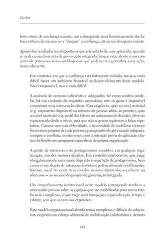 bons níveis de confiança iniciais, um subsequente mau funcionamento dos fatores críticos de sucesso vir a “dissipar” a confiança, até ao seu desaparecimento. Apesar dos resultados muito positivos que este estudo de caso apresenta, quando se avalia a sua dimensão de governação integrada, há que estar atento a um conjunto de potenciais riscos ou bloqueios que podem vir a perturbar a sua ação, nomeadamente: Em contextos em que a confiança está fortemente minada, torna-se mais difícil haver um ambiente favorável ao desenvolvimento deste modelo. Não é impossível, mas é mais difícil. A ausência de recursos suficientes e adequados: tal como noutros modelos, há um conjunto de requisitos necessários, sem os quais é impossível concretizar uma intervenção eficaz. Essa exigência, quer ao nível material (e.g. orçamento disponível ou número de pessoas afetas ao projeto), quer ao nível imaterial (e.g. perfil dos líderes ou autonomia de decisão), deve ser equacionada desde o início, para que não se gerem equívocos e falsas expetativas. Conexa com esta dificuldade, a necessidade de mobilizar recursos financeiros próprios de cada parceiro, para projetos de governação integrada, compete e conflitua, muitas vezes, com a intenção prévia de aplicação clássica de fundos em programas específicos da própria organização. A gestão de interesses e de protagonismos constitui, em qualquer organização, um dos maiores desafios. Em contexto colaborativo, que exige obrigatoriamente uma maior dispersão e repartição de protagonismo, bem como a conciliação de interesses distintos e potencialmente conflituantes, torna-se usual ter neste item um dos maiores obstáculos – evidente ou silencioso – ao sucesso do projeto de governação integrada. Um empenhamento institucional neste modelo corresponde também a uma maior pressão sobre as equipas que são mobilizadas para novas tarefas mais complexas, o que exige mais formação e especialização, tempo e esforço, sem que os recursos expandam. Este modelo organizacional aborda temas complexos e difíceis de solucionar, exigindo um esforço adicional de mobilização colaborativa e demora 132