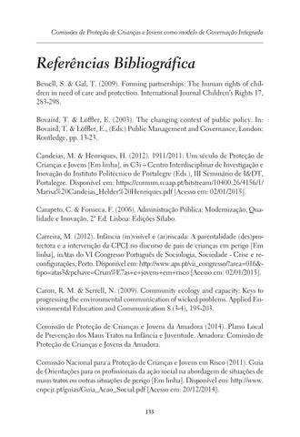 Referências Bibliográfica Bessell, S. & Gal, T. (2009). Forming partnerships: The human rights of children in need of care and protection. International Journal Children’s Rights 17, 283-298. Bovaird, T. & Löffler, E. (2003). The changing context of public policy. In: Bovaird, T. & Löffler, E., (Eds.) Public Management and Governance, London: Routledge, pp. 13-23. Candeias, M. & Henriques, H. (2012). 1911/2011: Um século de Proteção de Crianças e Jovens [Em linha], in C3i – Centro Interdisciplinar de Investigação e Inovação do Instituto Politécnico de Portalegre (Eds.), III Seminário de I&DT, Portalegre. Disponível em: https://comum.rcaap.pt/bitstream/10400.26/4156/1/ Marisa%20Candeias_Helder%20Henriques.pdf [Acesso em: 02/01/2015]. Carapeto, C. & Fonseca, F. (2006). Administração Pública: Modernização, Qualidade e Inovação, 2ª Ed. Lisboa: Edições Sílabo. Carreira, M. (2012). Infância (in)visível e (ar)riscada: A parentalidade (des)protectora e a intervenção da CPCJ no discurso de pais de crianças em perigo [Em linha], inAtas do VI Congresso Português de Sociologia, Sociedade - Crise e reconfigurações, Porto. Disponível em: http://www.aps.pt/vii_congresso/?area=016&tipo=atas3&pchave=Crian%E7as+e+jovens+em+risco [Acesso em: 02/01/2015]. Caron, R. M. & Serrell, N. (2009). Community ecology and capacity: Keys to progressing the environmental communication of wicked problems. Applied Environmental Education and Communication 8 (3-4), 195-203. Comissão de Proteção de Crianças e Jovens da Amadora (2014). Plano Local de Prevenção dos Maus Tratos na Infância e Juventude. Amadora: Comissão de Proteção de Crianças e Jovens da Amadora. Comissão Nacional para a Proteção de Crianças e Jovens em Risco (2011). Guia de Orientações para os profissionais da ação social na abordagem de situações de maus tratos ou outras situações de perigo [Em linha]. Disponível em: http://www. cnpcjr.pt/guias/Guia_Acao_Social.pdf [Acesso em: 20/12/2014]. 135
