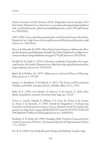 Núcleo Executivo CLAS Amadora (2014). Diagnóstico Social Amadora 2014 [Em linha]. Disponível em: http://www.cm-amadora.pt/images/artigos/solidaria/ rede_social/instrumentos_planeamento/pdf/diagnostico_social_2014.pdf [Acesso em: 26/03/2016]. ONU (1989). Convenção Internacional sobre os Direitos da Criança [Em linha]. Disponível em: http://www.ohchr.org/Documents/ProfessionalInterest/crc.pdf [Acesso em: 14/01/2014]. Pires, A. & Miyazaki, M. (2005). Maus-Tratos Contra Crianças e Adolescentes: Revisão da Literatura para Profissionais da Saúde [Em linha]. Disponível em: https://www. nescon.medicina.ufmg.br/biblioteca/imagem/2733.pdf [Acesso em: 02/12/2015]. Preskill, H. & Gopal, S. (2014). Evaluating complexity: Propositions for improving Practice [Em linha]. Disponível em: http://www.fsg.org/publications/evaluating-complexity [Acesso em: 15/05/2015]. Rittel, H. & Webber, M. (1973). Dillemmas in a General Theory of Planning. Policy Sciences 4, 155-169. Sanson, A., Havighurst, S. & Zubrick, S. (2011). The Science of Prevention for Children and Youth. Australian Review of Public Affairs 10 (1), 79-93. Stake, R. E. (1994). Case Studies. In: Denzin, N. & Lincoln, Y., (Eds.) Handbook of qualitative research, Newsbury Park: Sage, pp. 236-247. Torres, A. (coord.), Pegado, E., Hilário, A. P., Cruz, R., Penha, A. R., Freitas, A., Sousa, I. & Sarmento, S. (2008). Estudo de Diagnóstico e Avaliação das Comissões de Protecção de Crianças e Jovens: Relatório Final [Em linha]. Disponível em: http://www.cnpcjr.pt/CIES-ISCTE-Avalia%C3%A7%C3%A3o%20 CPCJ-Relat%C3%B3rio%20Final.pdf [Acesso em: 26/04/2014]. Waddock, S. & Walsh, M. (1999). Paradigm Shift: Toward a Community-University Community of Practice. International Journal of Organizational Analysis 7 (3), 244-264. Yin, R. K. (2009). Case Study Research Design and Methods. London: Sage. 138