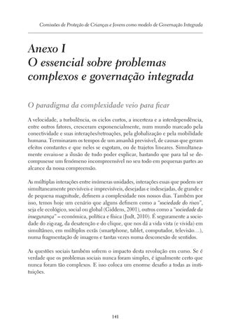Anexo I O essencial sobre problemas complexos e governação integrada O paradigma da complexidade veio para ficar A velocidade, a turbulência, os ciclos curtos, a incerteza e a interdependência, entre outros fatores, cresceram exponencialmente, num mundo marcado pela conectividade e suas interações/retroações, pela globalização e pela mobilidade humana. Terminaram os tempos de um amanhã previsível, de causas que geram efeitos constantes e que neles se esgotam, ou de trajetos lineares. Simultaneamente esvaiu-se a ilusão de tudo poder explicar, bastando que para tal se decompusesse um fenómeno incompreensível no seu todo em pequenas partes ao alcance da nossa compreensão. As múltiplas interações entre inúmeras unidades, interações essas que podem ser simultaneamente previsíveis e imprevisíveis, desejadas e indesejadas, de grande e de pequena magnitude, definem a complexidade nos nossos dias. Também por isso, temos hoje um cenário que alguns definem como a “sociedade do risco”, seja ele ecológico, social ou global (Giddens, 2001), outros como a “sociedade da insegurança” – económica, política e física (Judt, 2010). É seguramente a sociedade do zig-zag, da desatenção e do clique, que nos dá a vida vista (e vivida) em simultâneo, em múltiplos ecrãs (smartphone, tablet, computador, televisão…), numa fragmentação de imagens e tantas vezes numa desconexão de sentidos. As questões sociais também sofrem o impacto desta revolução em curso. Se é verdade que os problemas sociais nunca foram simples, é igualmente certo que nunca foram tão complexos. E isso coloca um enorme desafio a todas as instituições.