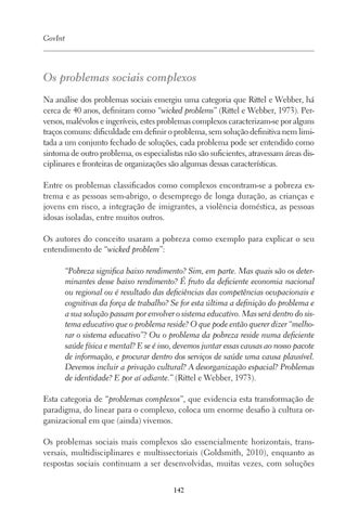 Os problemas sociais complexos Na análise dos problemas sociais emergiu uma categoria que Rittel e Webber, há cerca de 40 anos, definiram como “wicked problems” (Rittel e Webber, 1973). Perversos, malévolos e ingeríveis, estes problemas complexos caracterizam-se por alguns traços comuns: dificuldade em definir o problema, sem solução definitiva nem limitada a um conjunto fechado de soluções, cada problema pode ser entendido como sintoma de outro problema, os especialistas não são suficientes, atravessam áreas disciplinares e fronteiras de organizações são algumas dessas características. Entre os problemas classificados como complexos encontram-se a pobreza extrema e as pessoas sem-abrigo, o desemprego de longa duração, as crianças e jovens em risco, a integração de imigrantes, a violência doméstica, as pessoas idosas isoladas, entre muitos outros. Os autores do conceito usaram a pobreza como exemplo para explicar o seu entendimento de “wicked problem”: “Pobreza significa baixo rendimento? Sim, em parte. Mas quais são os determinantes desse baixo rendimento? É fruto da deficiente economia nacional ou regional ou é resultado das deficiências das competências ocupacionais e cognitivas da força de trabalho? Se for esta última a definição do problema e a sua solução passam por envolver o sistema educativo. Mas será dentro do sistema educativo que o problema reside? O que pode então querer dizer “melhorar o sistema educativo”? Ou o problema da pobreza reside numa deficiente saúde física e mental? E se é isso, devemos juntar essas causas ao nosso pacote de informação, e procurar dentro dos serviços de saúde uma causa plausível. Devemos incluir a privação cultural? A desorganização espacial? Problemas de identidade? E por aí adiante.” (Rittel e Webber, 1973). Esta categoria de “problemas complexos”, que evidencia esta transformação de paradigma, do linear para o complexo, coloca um enorme desafio à cultura organizacional em que (ainda) vivemos. Os problemas sociais mais complexos são essencialmente horizontais, transversais, multidisciplinares e multissectoriais (Goldsmith, 2010), enquanto as respostas sociais continuam a ser desenvolvidas, muitas vezes, com soluções 142