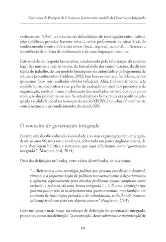 O conceito de governação integrada Perante este desafio colocado à sociedade e às suas organizações tem emergido, desde os anos 90, uma nova tendência, sobretudo nos países anglo-saxónicos, de uma abordagem holística e sistémica, que aqui referiremos como “governação integrada ” (Marques, et al, 2014). Uma das definições utilizadas, entre várias identificadas, situa-a como: “… Referente a uma estratégia política que procura coordenar o desenvolvimento e a implementação de políticas transversalmente a departamentos e agências, especialmente para abordar problemas sociais complexos como exclusão e pobreza, de uma forma integrada (…). É uma estratégia que procura juntar não só os departamentos governamentais, mas também um conjunto de instituições privadas e de voluntariado, trabalhando transversalmente tendo em vista um objetivo comum” (Bogdanor, 2005). Indo um pouco mais longe no esforço de definição de governação integrada, propomos como sua definição, “a construção, desenvolvimento e manutenção de 143